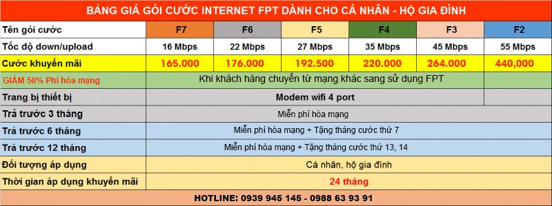 * Ưu đãi miễn phí lắp Internet FPT Sinh Viên và người Thuê nhà: Chỉ cần đặt cọc 440.000 đồng (Trừ cước lại khi sử dụng hết 24 tháng), hoặc trả trước 6 tháng thì không cần đặc cọc.